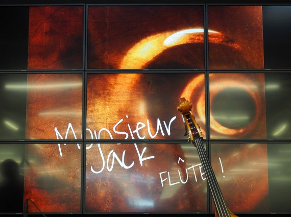 Monsieur Jack en concert, c’est des instruments venant du monde entier : des flûtes qui vous transportent le cœur et des percussions qui le font battre, et une contrebasse qui vient opportunément se mêler à l’aventure grâce à Galli !